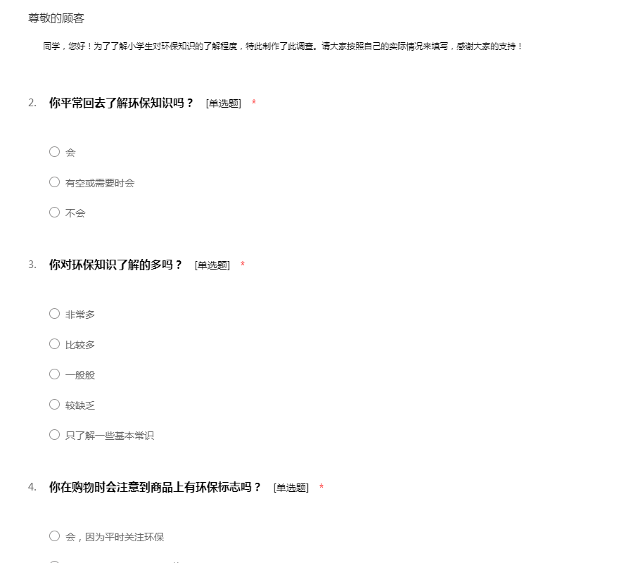同学,您好!为了了解小学生对环保知识的了解程度,特此制作了此调查。请大家按照自己的实际情况来填写,感谢大家的支持!