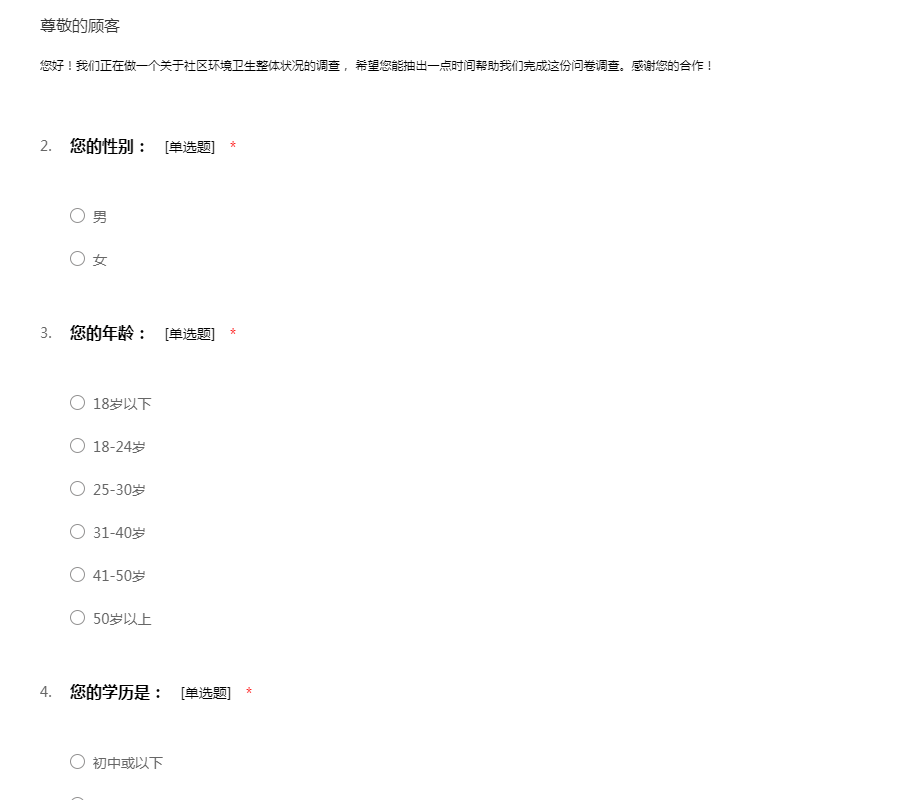 您好!我们正在做一个关于社区环境卫生整体状况的调查, 希望您能抽出一点时间帮助我们完成这份问卷调查。感谢您的合作!