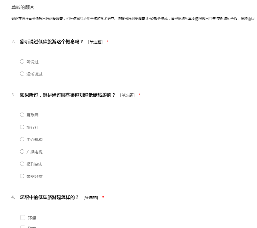 现正在进行有关低碳出行问卷调查,相关信息只应用于旅游学术研究。低碳出行问卷调查共由2部分组成,请根据您的真实情况做出回答!感谢您的合作,祝您愉快!