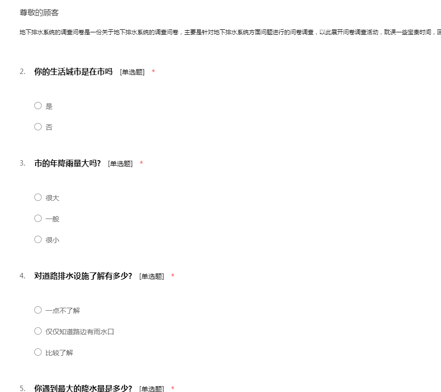地下排水系统的调查问卷是一份关于地下排水系统的调查问卷,主要是针对地下排水系统方面问题进行的问卷调查,以此展开问卷调查活动,耽误一些宝贵时间,回答地下排水系统的调查问卷,谢谢的合作。