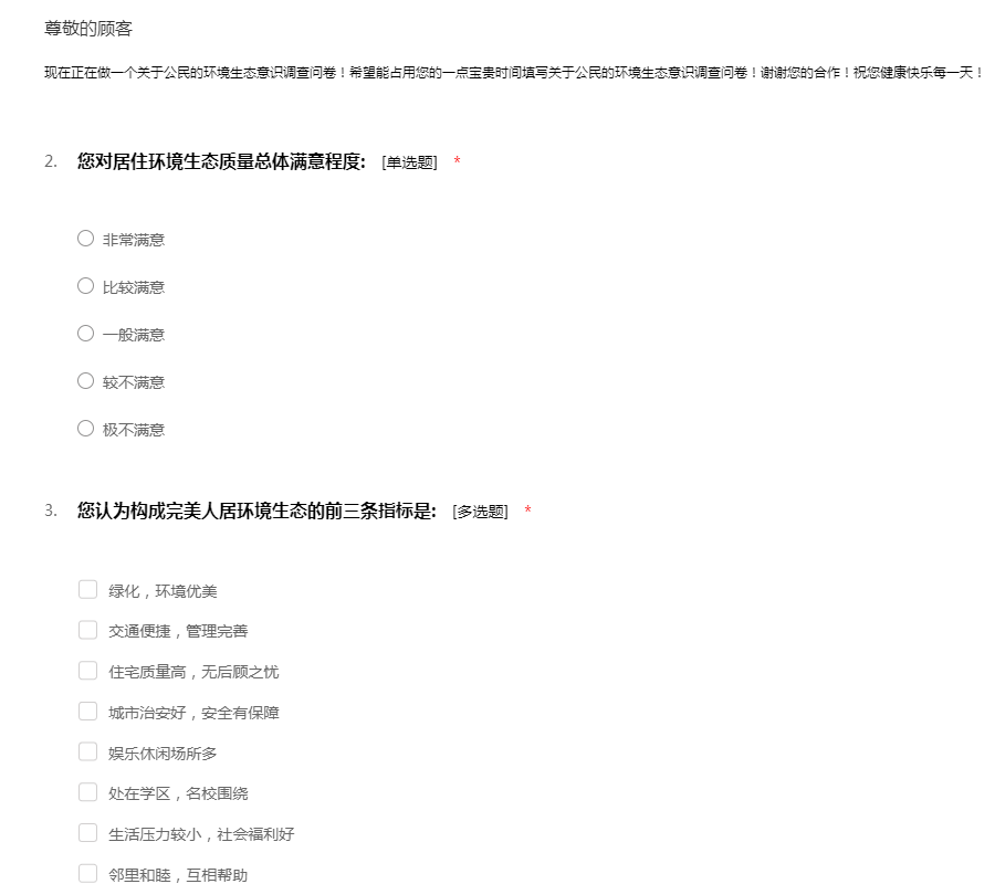 现在正在做一个关于公民的环境生态意识调查问卷!希望能占用您的一点宝贵时间填写关于公民的环境生态意识调查问卷!谢谢您的合作!祝您健康快乐每一天!
