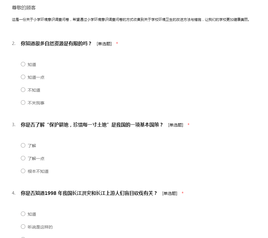 您好!现在生态环境方面却出现了不少问题,故本次开展了关于生态环境的调查问卷,感谢您在百忙之中抽空填写问卷!