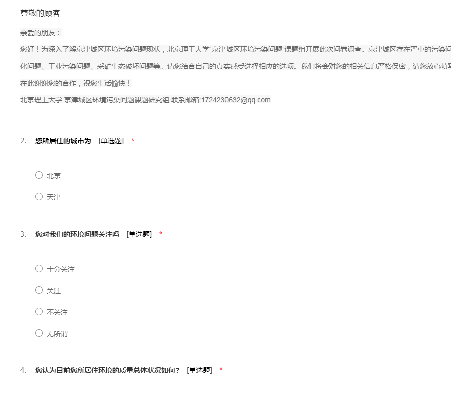 亲爱的朋友: 您好!为深入了解京津城区环境污染问题现状,北京理工大学“京津城区环境污染问题”课题组开展此次问卷调查。京津城区存在严重的污染问题,主要包括城市空气质量问题、植被退化问题、工业污染问题、采矿生态破坏问题等。请您结合自己的真实感受选择相应的选项。我们将会对您的相关信息严格保密,请您放心填写! 在此谢谢您的合作,祝您生活愉快! 北京理工大学 京津城区环境污染问题课题研究组 联系邮箱:1724230632@qq.com