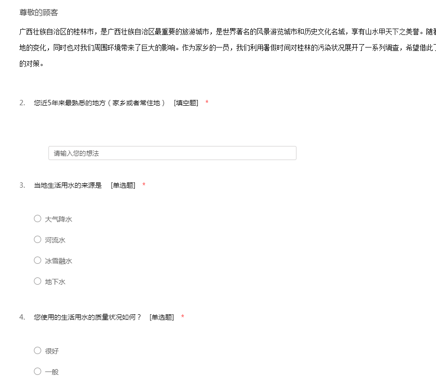 广西壮族自治区的桂林市,是广西壮族自治区最重要的旅游城市,是世界著名的风景游览城市和历史文化名城,享有山水甲天下之美誉。随着旅游业的日益发展,桂林发生了翻天覆地的变化,同时也对我们周围环境带来了巨大的影响。作为家乡的一员,我们利用暑假时间对桂林的污染状况展开了一系列调查,希望借此了解家乡环境的状况,找到改善家乡环境的对策。谢谢您的配合!