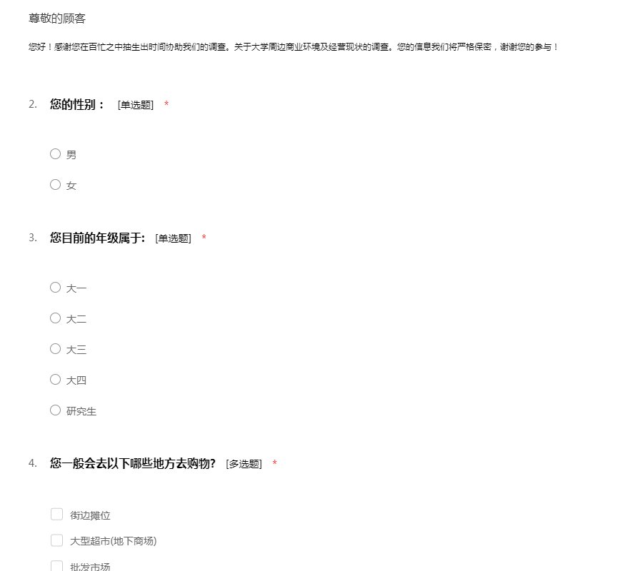 您好!感谢您在百忙之中抽生出时间协助我们的调查。关于大学周边商业环境及经营现状的调查。您的信息我们将严格保密,谢谢您的参与!