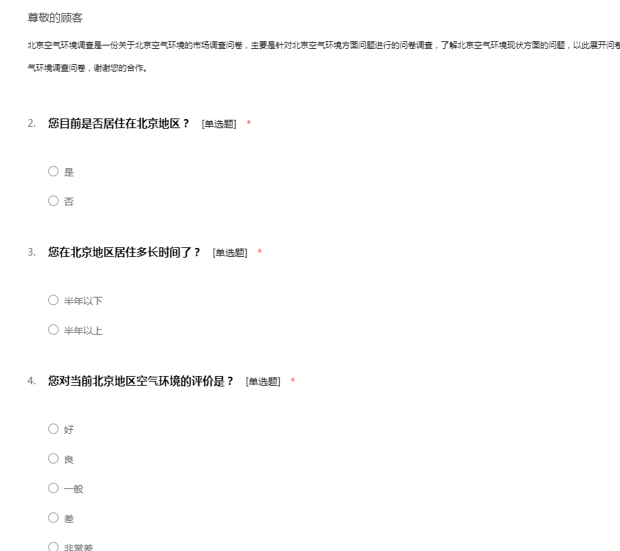 北京空气环境调查是一份关于北京空气环境的市场调查问卷,主要是针对北京空气环境方面问题进行的问卷调查,了解北京空气环境现状方面的问题,以此展开问卷调查活动,耽误您一些 宝贵时间,回答北京空气环境调查问卷,谢谢您的合作。