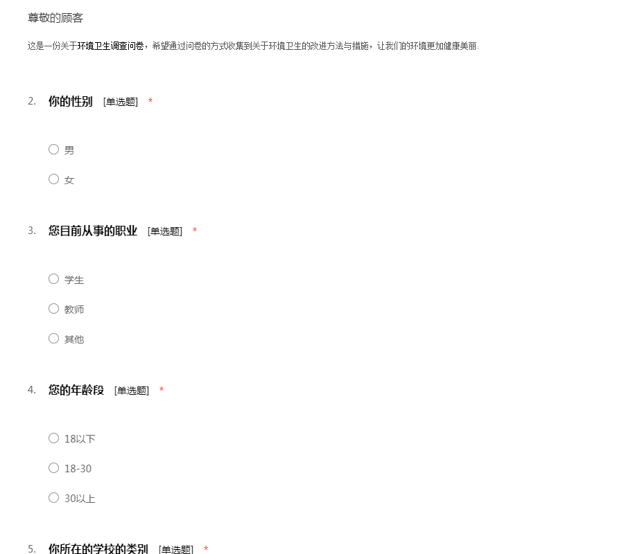 您好!耽误您几分钟时间,这是一份关于环境卫生调查问卷,希望通过问卷的方式收集到关于环境卫生的改进方法与措施,让我们的环境更加健康美丽。谢谢!