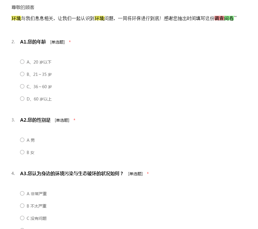 环境与我们息息相关,让我们一起认识到环境问题,一同将环保进行到底!感谢您抽出时间填写这份调查问卷~