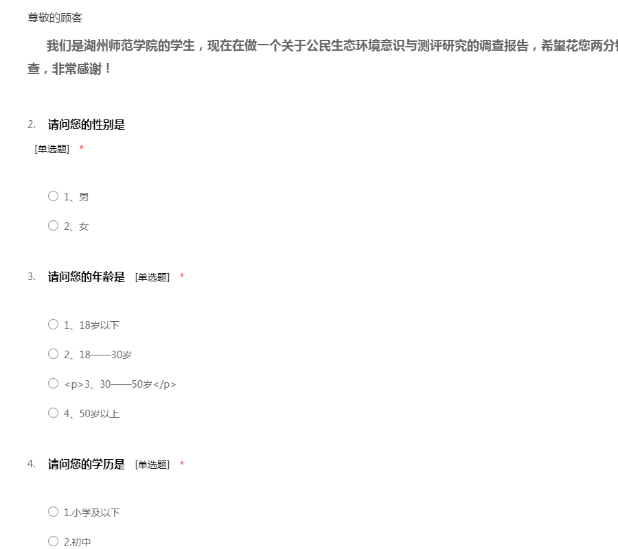 我们是湖州师范学院的学生,现在在做一个关于公民生态环境意识与测评研究的调查报告,希望花您两分钟的时间,帮助我们完成这项调查,非常感谢!