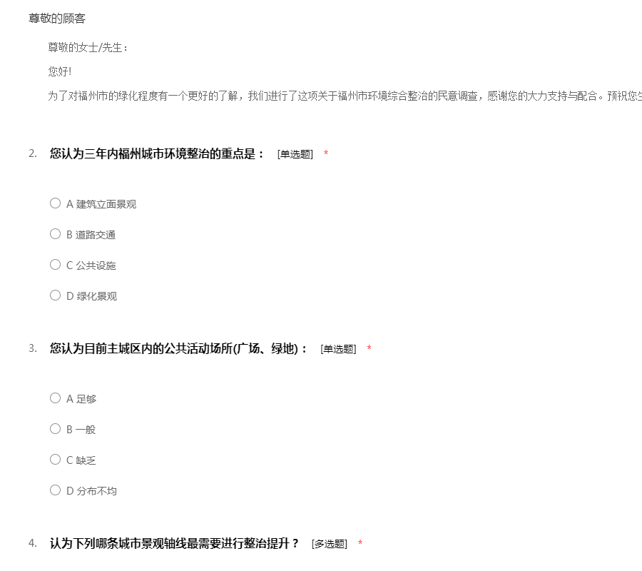 尊敬的女士/先生: 您好! 为了对福州市的绿化程度有一个更好的了解,我们进行了这项关于福州市环境综合整治的民意调查,感谢您的大力支持与配合。预祝您生活愉快!谢谢!