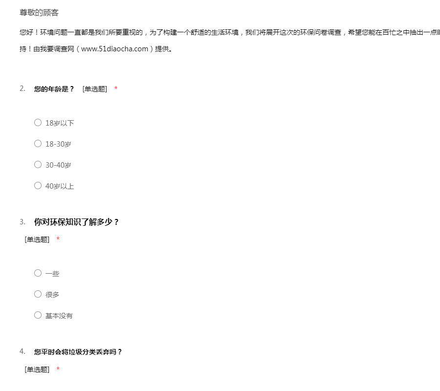 您好!环境问题一直都是我们所要重视的,为了构建一个舒适的生活环境,我们将展开这次的环保问卷调查,希望您能在百忙之中抽出一点时间配合我们的调查,在此感谢您的支持!由我要调查网(www.51diaocha.com)提供。