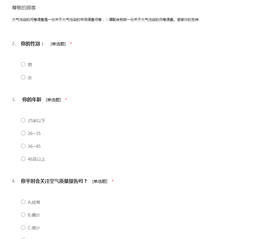 大气污染的问卷调查是一份关于大气污染的市场调查问卷,!请配合我做一份关于大气污染的问卷调查。感谢你的支持.