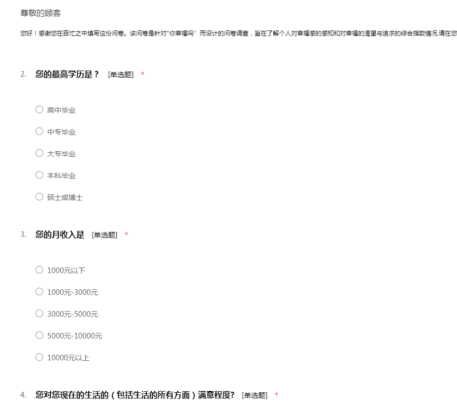 您好!感谢您在百忙之中填写这份问卷。该问卷是针对"你幸福吗”而设计的问卷调查,旨在了解个人对幸福感的感知和对幸福的渴望与追求的综合指数情况.请在您认为合适的答案天下。谢谢