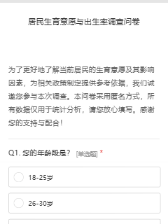 为了更好地了解当前居民的生育意愿及其影响因素,为相关政策制定提供参考依据,我们诚邀您参与本次调查。本问卷采用匿名方式,所有数据仅用于统计分析,请您放心填写。感谢您的支持与配合!