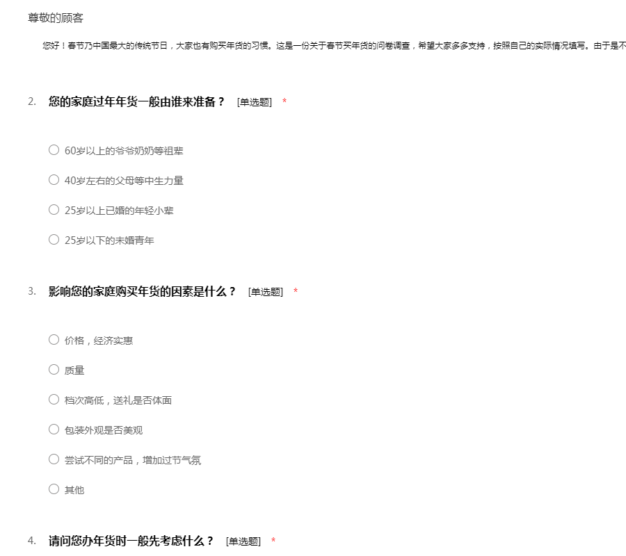 您好!感谢您参与51调查网关于春节年货购买消费情况的调查问卷,本问卷采取不记名形式,数据只用于调研报告分析,保证您提供的信息绝对保密。感谢您的配合与支持