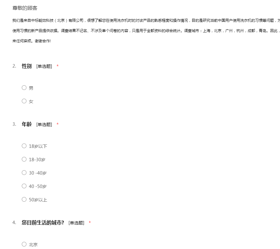 我们是来自中标能效科技(北京)有限公司,很想了解您在使用洗衣机时的对该产品的熟悉程度和操作情况,目的是研究当前中国用户使用洗衣机的习惯等问题,为政府制定政策和推进企业研发生产符合中国用户使用习惯的新产品提供依据。调查结果不记名、不涉及单个问卷的内容,只是用于全都资料的综合统计。调查城市:上海,北京,广州,杭州,成都,青岛。因此,不会影响您家庭的购买和使用,也不会给您家带来任何麻烦。谢谢合作!