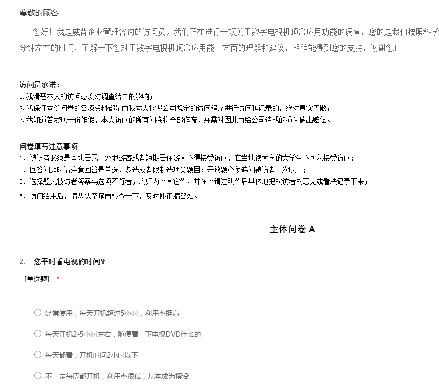 您好!我是威普企业管理咨询的访问员。我们正在进行一项关于数字电视机顶盒应用功能的调查,您的是我们按照科学方法选到的访问对象,希望占用您几分钟左右的时间,了解一下您对于数字电视机顶盒应用能上方面的理解和建议,相信能得到您的支持,谢谢您!
