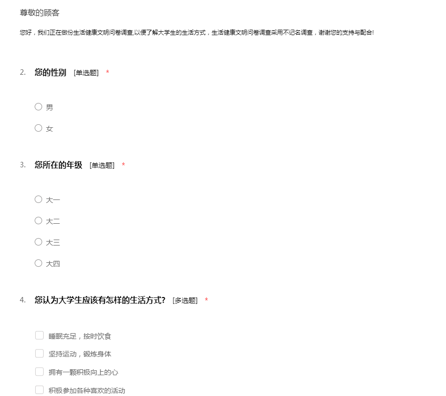 您好,我们正在做份生活健康文明问卷调查,以便了解大学生的生活方式,生活健康文明问卷调查采用不记名调查,谢谢您的支持与配合!