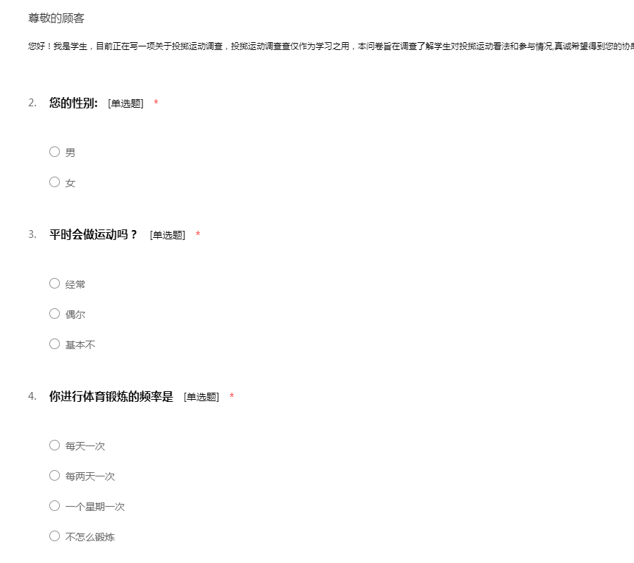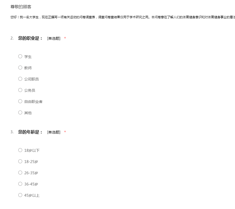 您好!我一名大学生,现在正撰写一项有关运动的问卷调查表,调查问卷查结果仅用于学术研究之用。本问卷意在了解人们的体育健身意识和对体育健身事业的看法,希望得到您真诚的回答。感谢您的支持!