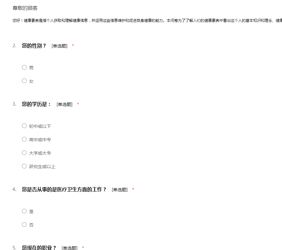 您好!健康素养是指个人获取和理解健康信息,并运用这些信息维护和促进自身健康的能力。本问卷为了了解人们的健康素养中看出这个人的基本知识和理念、健康生活方式与行为、基本技能。期待您的参与!