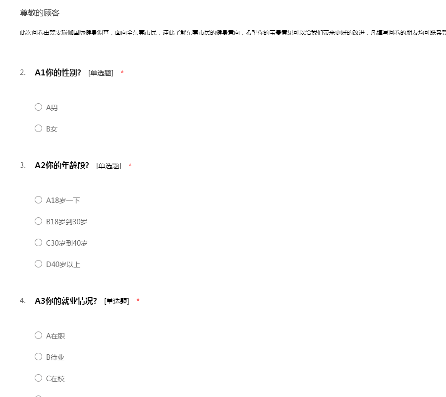 此次问卷由梵雯瑜伽国际健身调查,面向全东莞市民,谨此了解东莞市民的健身意向,希望你的宝贵意见可以给我们带来更好的改进,凡填写问卷的朋友均可联系梵雯瑜伽国际健身会籍顾问,免费体验一次