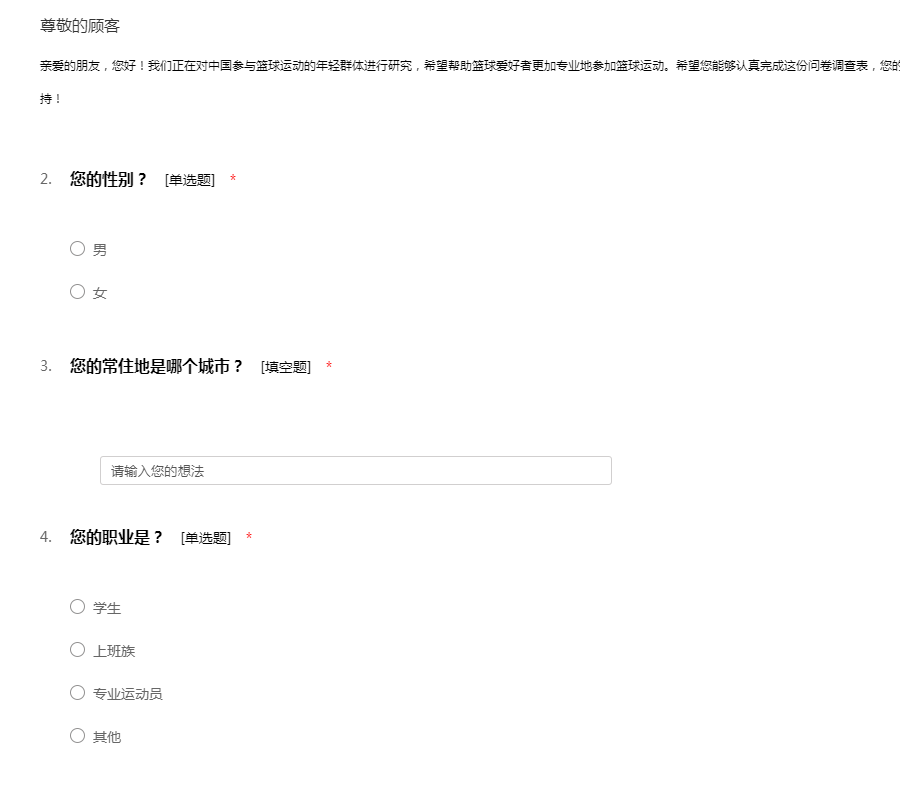 亲爱的朋友,您好!我们正在对中国参与篮球运动的年轻群体进行研究,希望帮助篮球爱好者更加专业地参加篮球运动。希望您能够认真完成这份问卷调查表,您的每一项选择都将对我们至关重要。感谢您的支持!