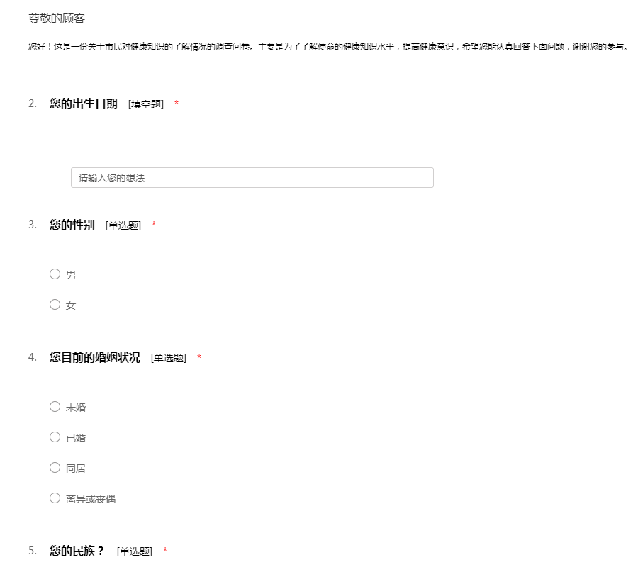 您好!这是一份关于市民对健康知识的了解情况的调查问卷。主要是为了了解使命的健康知识水平,提高健康意识,希望您能认真回答下面问题,谢谢您的参与。