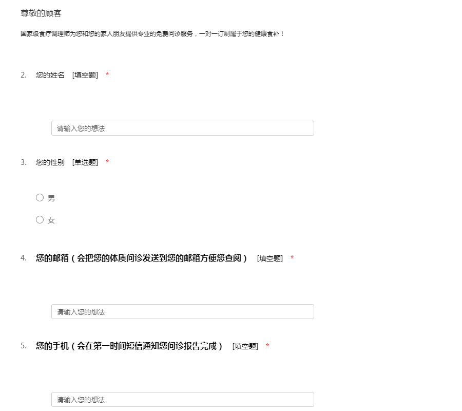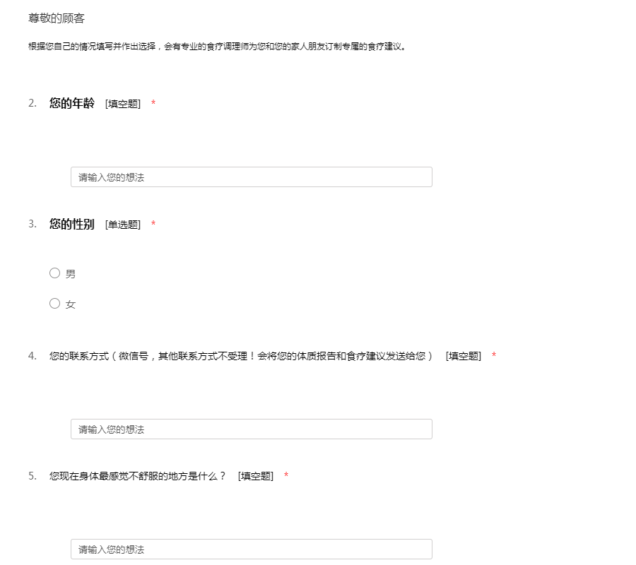 根据您自己的情况填写并作出选择,会有专业的食疗调理师为您和您的家人朋友订制专属的食疗建议。
