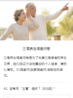 三高养生调查问卷是为了收集三高患者的养生习惯,我们保证不会泄露您的个人信息,请放心填写。51调查网(我要调查网)谢谢您的参与。