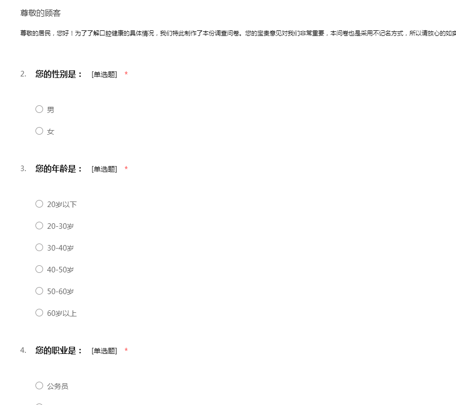 尊敬的居民,您好!为了了解口腔健康的具体情况,我们特此制作了本份调查问卷。您的宝贵意见对我们非常重要,本问卷也是采用不记名方式,所以请放心的如实填写。感谢您的支持与配合!