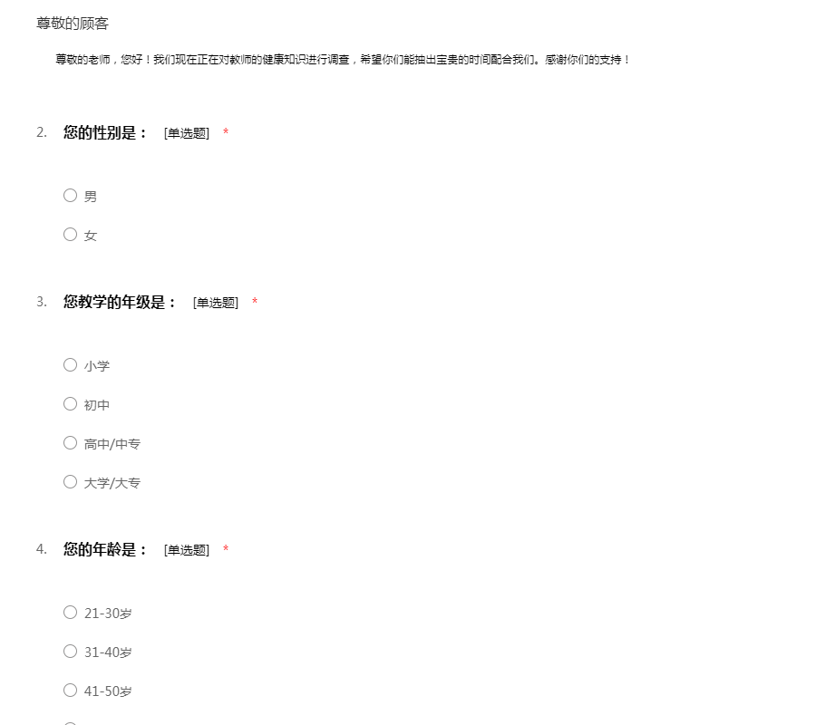 尊敬的老师,您好!我们现在正在对教师的健康知识进行调查,希望你们能抽出宝贵的时间配合我们。感谢你们的支持!