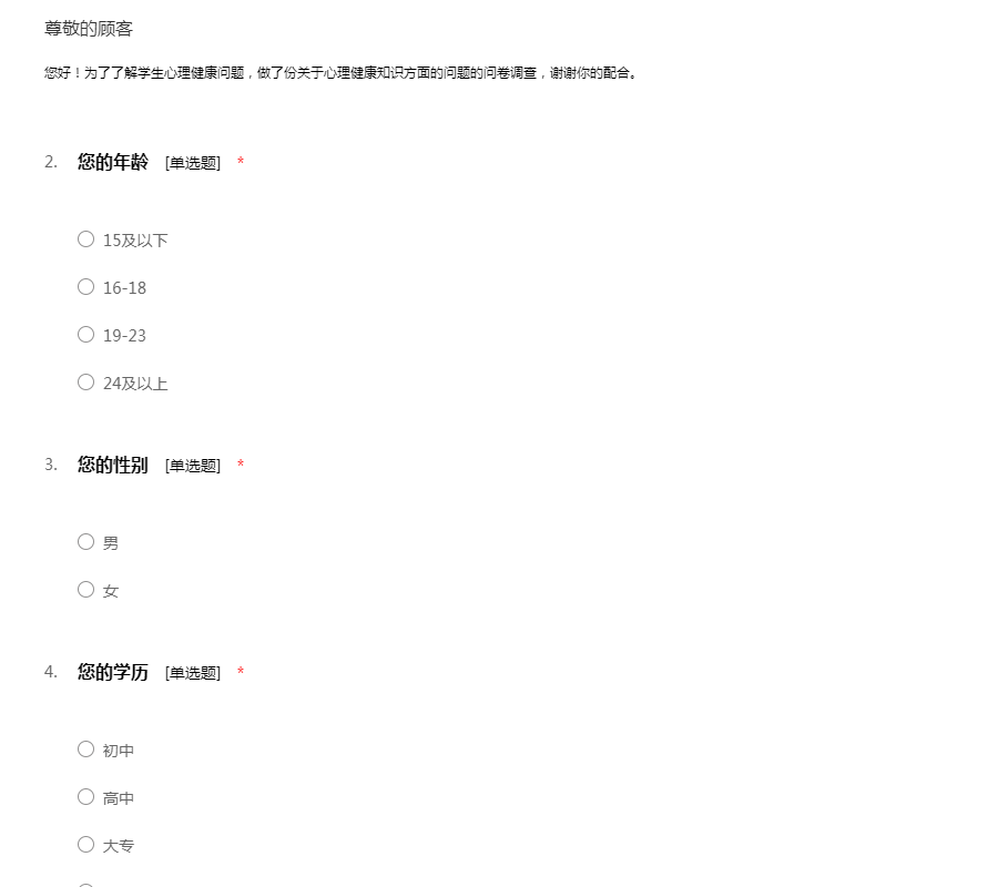 您好!为了了解学生心理健康问题,做了份关于心理健康知识方面的问题的问卷调查,谢谢你的配合。