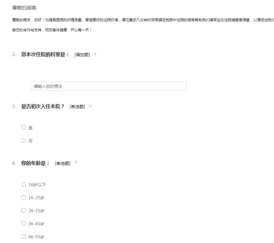 尊敬的病友,您好!为提高医院的护理质量、营造更好的住院环境,请花费您几分钟时间根据在我院中住院的感受帮助我们填写这份住院满意度调查,以便促进我们改善工作。问卷采用匿名制,请放心填写! 感谢您的合作与支持,祝您身体健康,开心每一天!