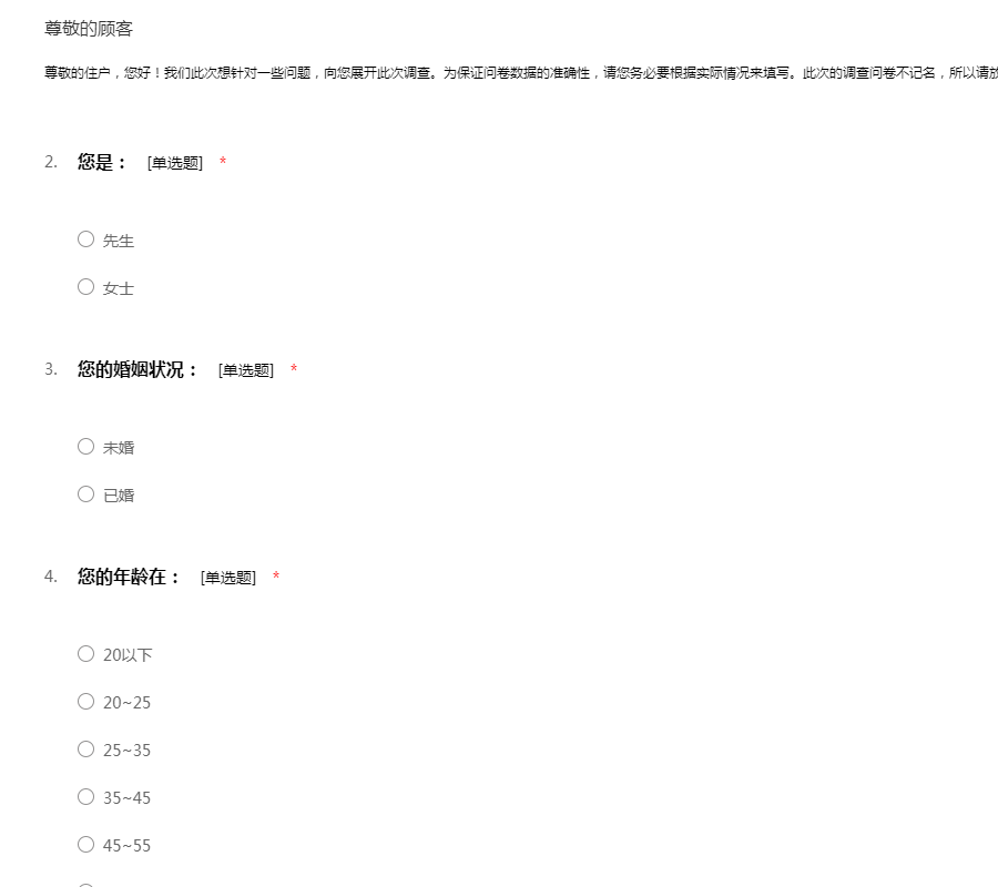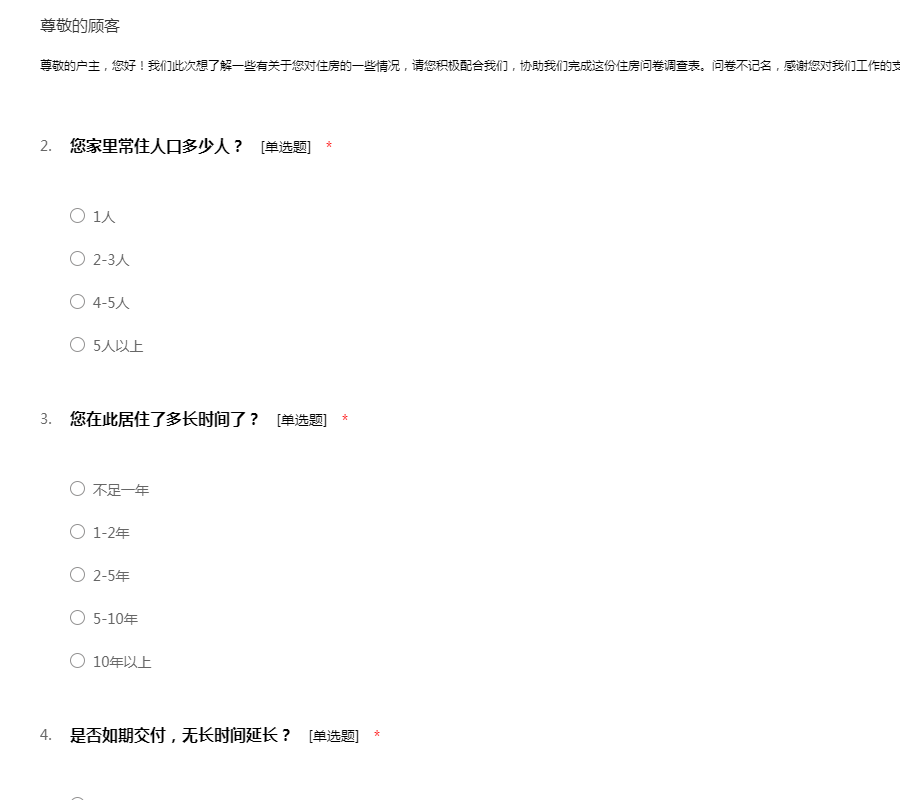 尊敬的住户,您好!我们此次想针对一些问题,向您展开此次调查。为保证问卷数据的准确性,请您务必要根据实际情况来填写。此次的调查问卷不记名,所以请放心填答。感谢您的支持与协助!