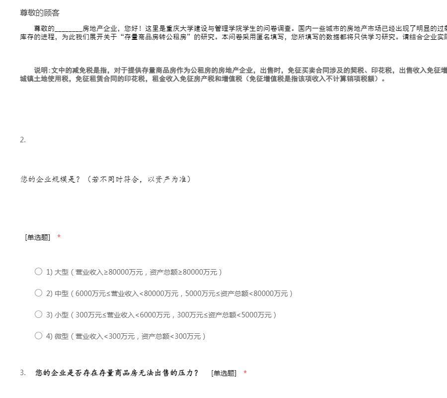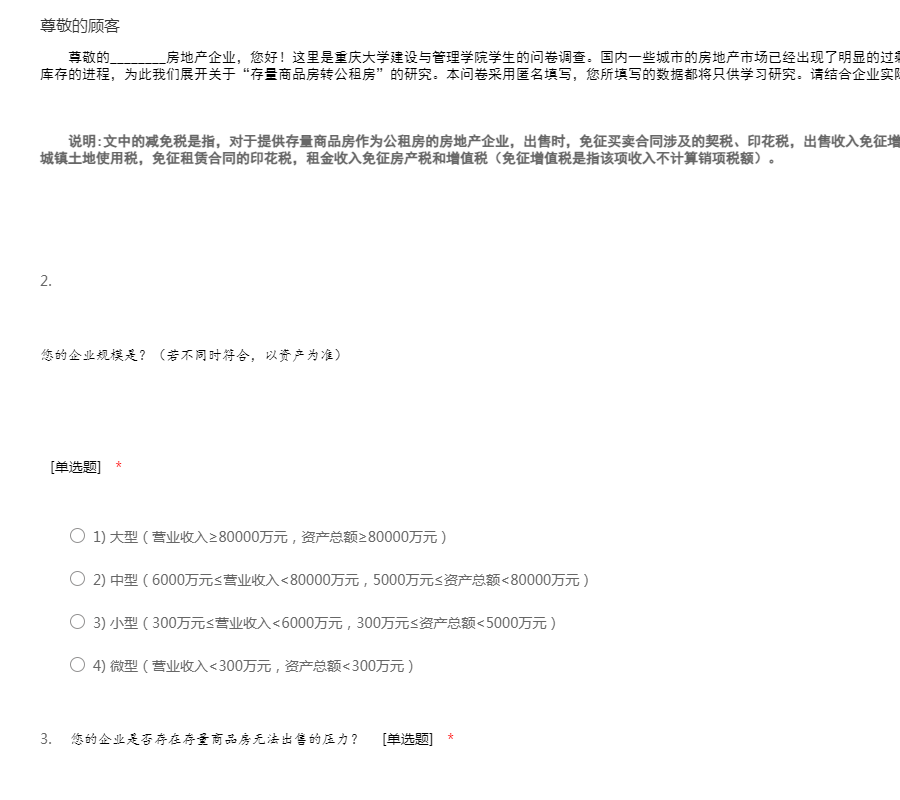 尊敬的________房地产企业,您好!这里是重庆大学建设与管理学院学生的问卷调查。国内一些城市的房地产市场已经出现了明显的过剩,需要通过相关政策加快房地产市场去库存的进程,为此我们展开关于“存量商品房转公租房”的研究。本问卷采用匿名填写,您所填写的数据都将只供学习研究。请结合企业实际情况真实填写,由衷感谢您的帮助!