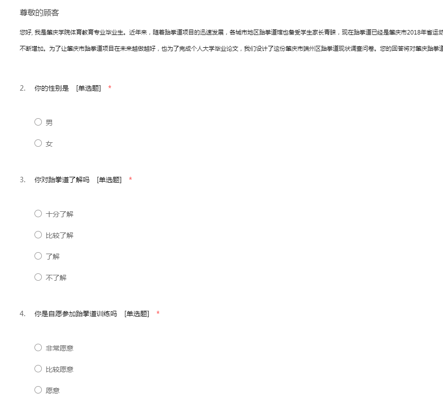 您好, 我是肇庆学院体育教育专业毕业生。近年来,随着跆拳道项目的迅速发展,各城市地区跆拳道馆也备受学生家长青睐,现在跆拳道已经是肇庆市2018年省运动会的正式比赛项目,每年参与跆拳道学习的人数不断增加。为了让肇庆市跆拳道项目在未来越做越好,也为了完成个人大学毕业论文,我们设计了这份肇庆市端州区跆拳道现状调查问卷。您的回答将对肇庆跆拳道的发展有重大意义,希望您能抽出一点时间填写