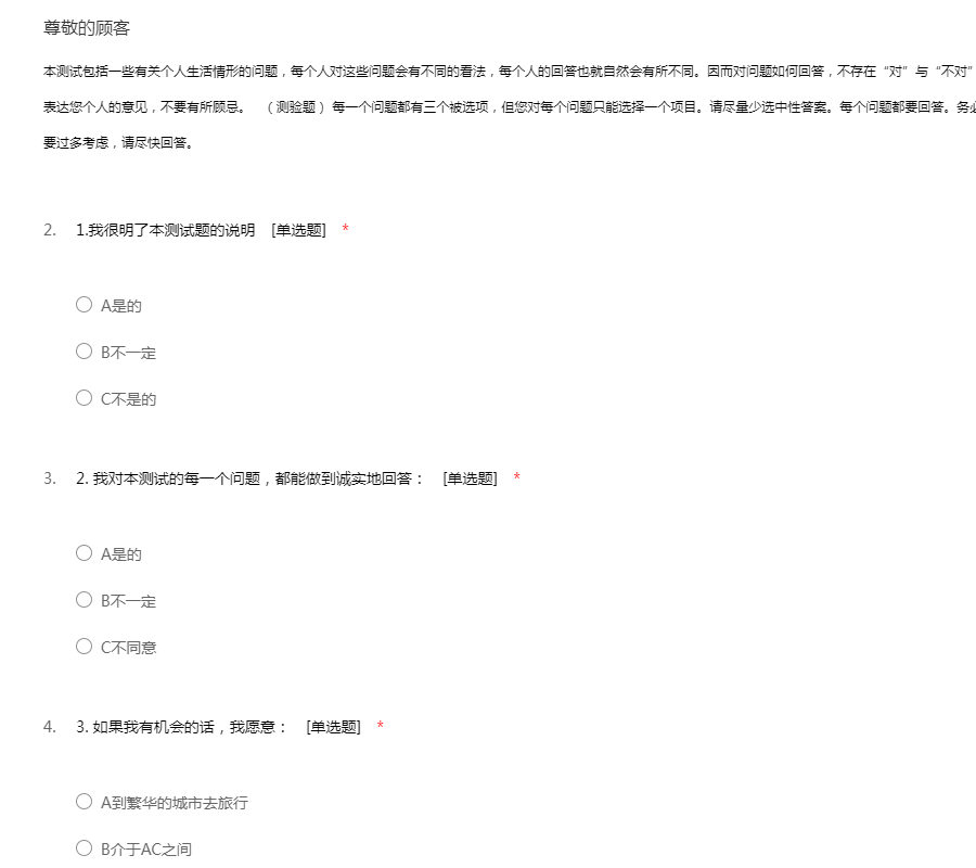 本测试包括一些有关个人生活情形的问题,每个人对这些问题会有不同的看法,每个人的回答也就自然会有所不同。因而对问题如何回答,不存在“对”与“不对”之分,只是表明您对这些问题的态度。请您尽量表达您个人的意见,不要有所顾忌。 (测验题) 每一个问题都有三个被选项,但您对每个问题只能选择一个项目。请尽量少选中性答案。每个问题都要回答。务必请您根据自己的实际情况回答。对每个问题不要过多考虑,请尽快回答。