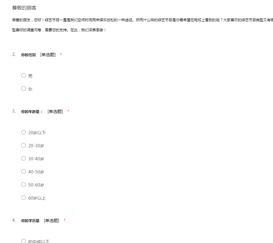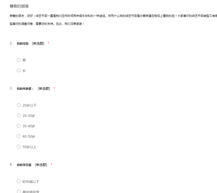 亲爱的朋友,您好!综艺节目一直是我们空闲时间用来娱乐放松的一种途径。然而什么样的综艺节目是你最希望在电视上看到的呢?大家喜欢的综艺节目类型又有哪些?为此,我们想进行这项关于电视综艺节目类型喜好的调查问卷,需要您的支持。在此,我们深表感谢!