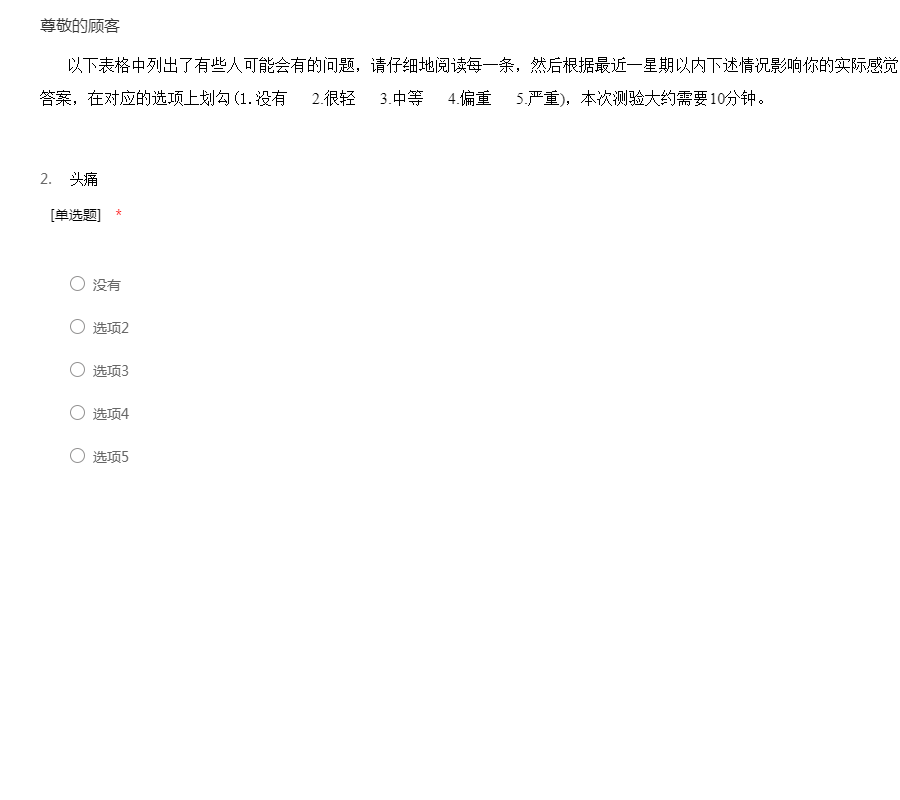 以下表格中列出了有些人可能会有的问题,请仔细地阅读每一条,然后根据最近一星期以内下述情况影响你的实际感觉,在五个答案里选择一个最适合你的答案,在对应的选项上划勾(1.没有 2.很轻 3.中等 4.偏重 5.严重),本次测验大约需要10分钟。