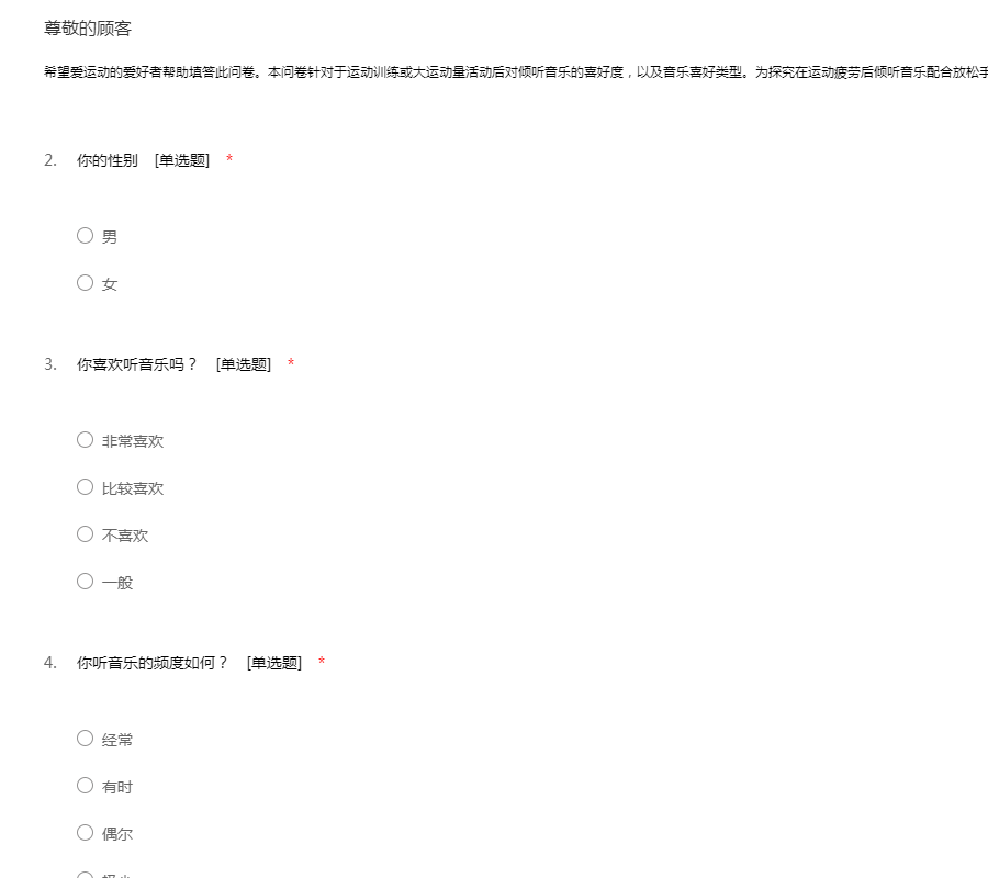 希望爱运动的爱好者帮助填答此问卷。本问卷针对于运动训练或大运动量活动后对倾听音乐的喜好度,以及音乐喜好类型。为探究在运动疲劳后倾听音乐配合放松手法是否可以减短体能恢复时间。