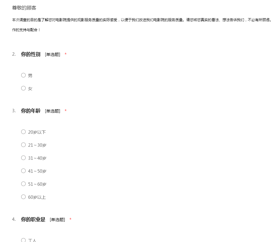 本次调查的目的是了解您对电影院提供的观影服务质量的实际感受,以便于我们改进我们电影院的服务质量。请您将您真实的看法、想法告诉我们,不必有所顾虑。我们对您提供的资料绝对保密。谢谢您对我们工作的支持与配合!