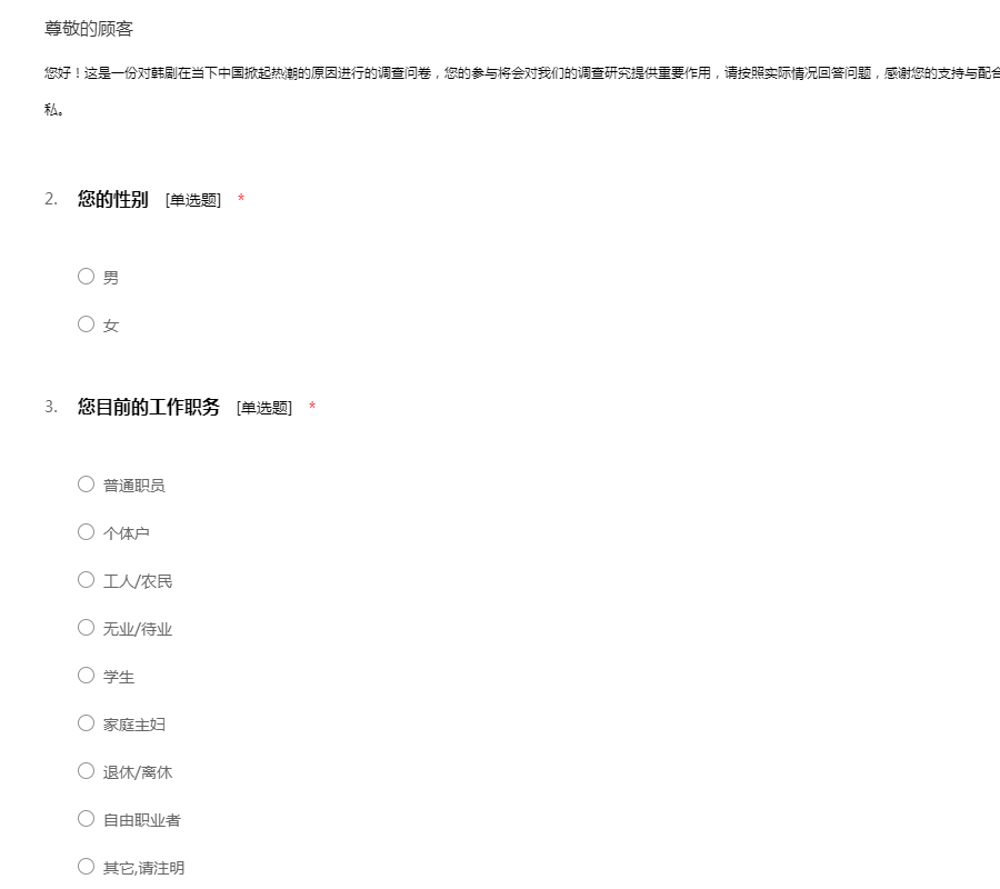您好!这是一份对韩剧在当下中国掀起热潮的原因进行的调查问卷,您的参与将会对我们的调查研究提供重要作用,请按照实际情况回答问题,感谢您的支持与配合!本问卷仅用于数据分析,不会透露您的个人隐私。