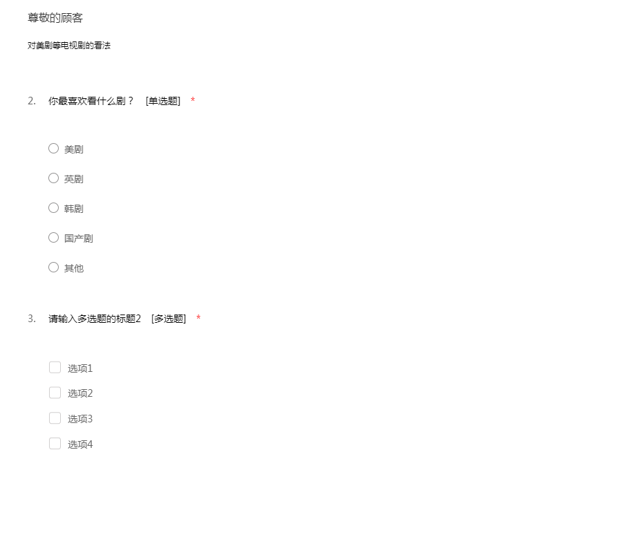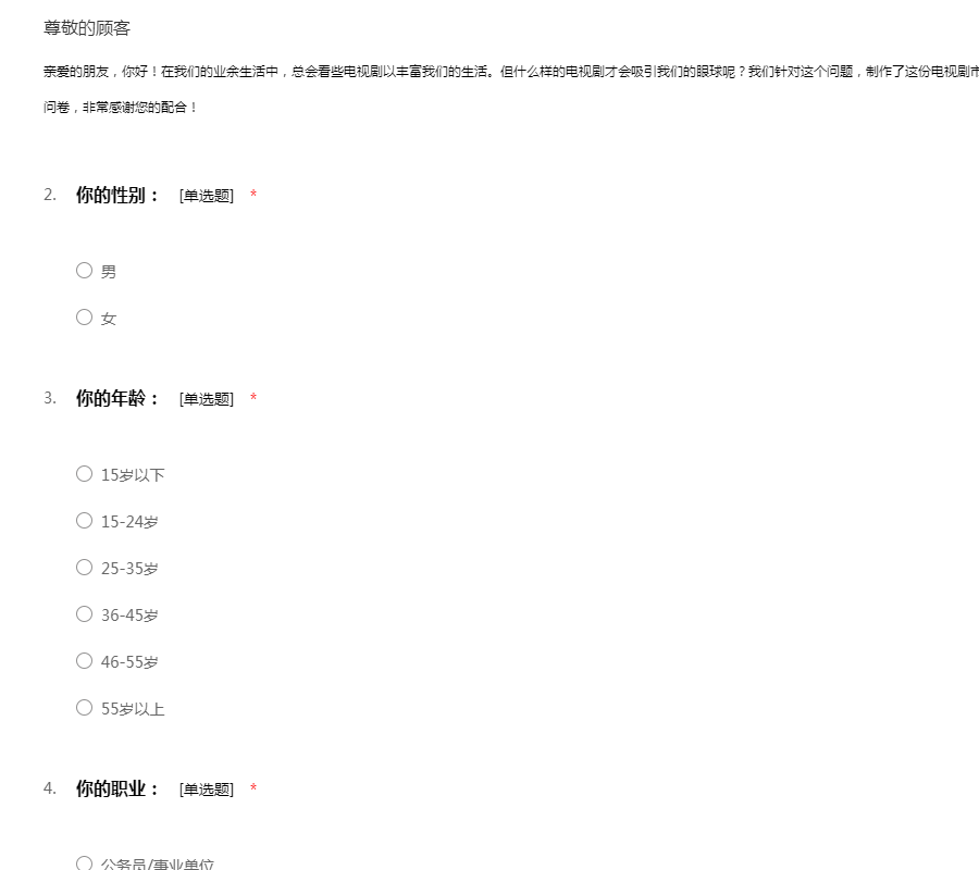 亲爱的朋友,你好!在我们的业余生活中,总会看些电视剧以丰富我们的生活。但什么样的电视剧才会吸引我们的眼球呢?我们针对这个问题,制作了这份电视剧市场调查问卷。请您根据自身的实际情况填写这份问卷,非常感谢您的配合!