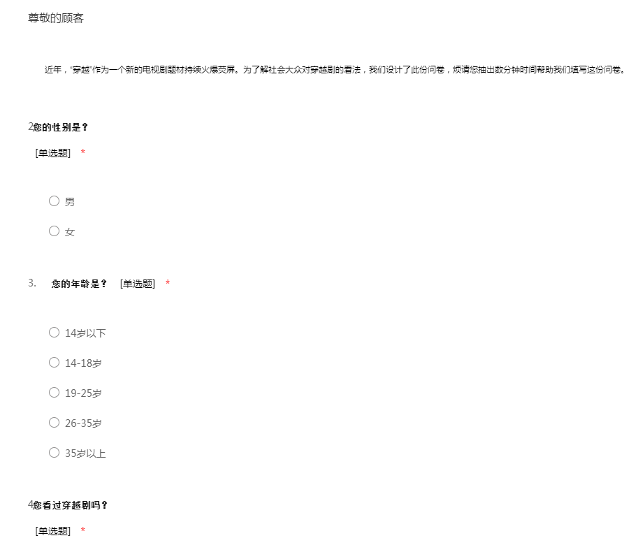 近年,“穿越”作为一个新的电视剧题材持续火爆荧屏。为了解社会大众对穿越剧的看法,我们设计了此份问卷,烦请您抽出数分钟时间帮助我们填写这份问卷。由衷感谢您的配合!