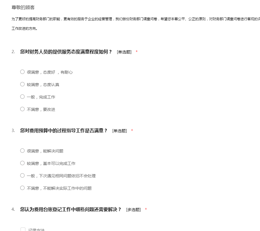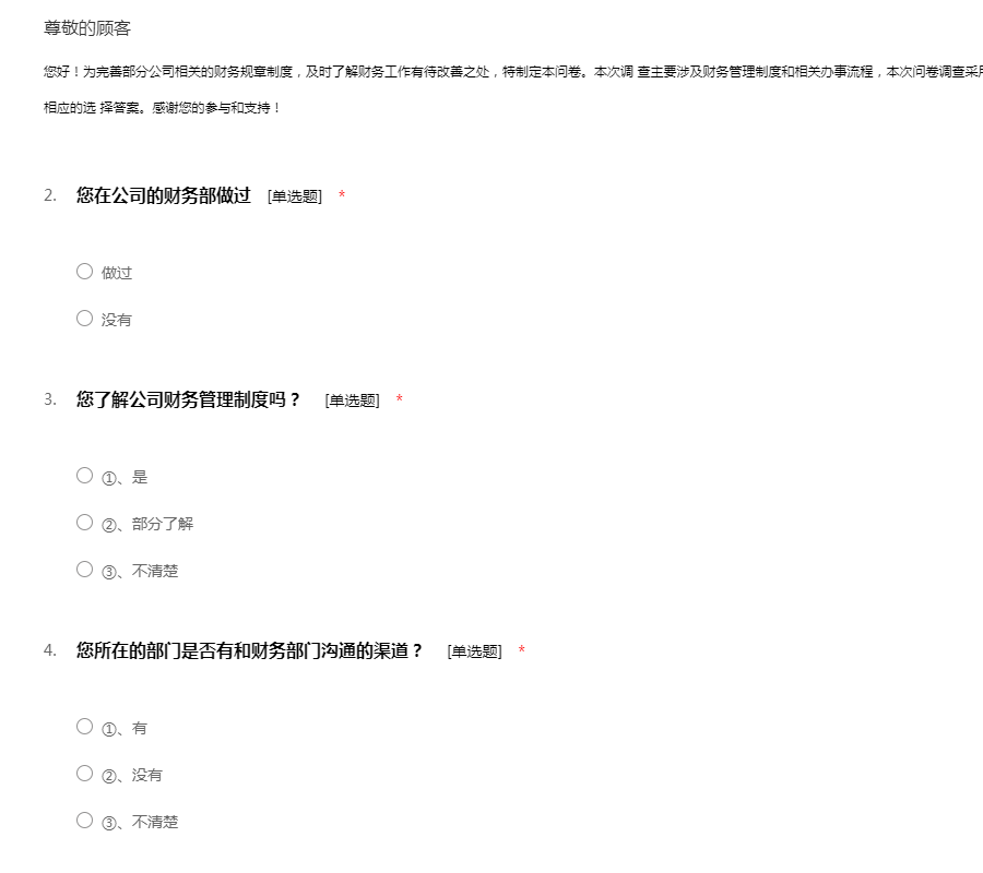 您好!为了进一步了解大众对财务工作的内容,我们诚挚邀请您参与“财务调查”问卷,本问卷实行匿名制,所有数据只用于统计分析, 请您放心填写。51调查网(我要调查网)谢谢您的参与。