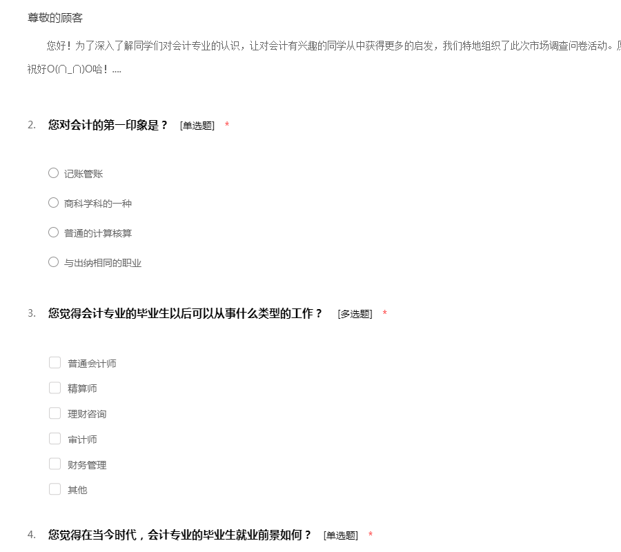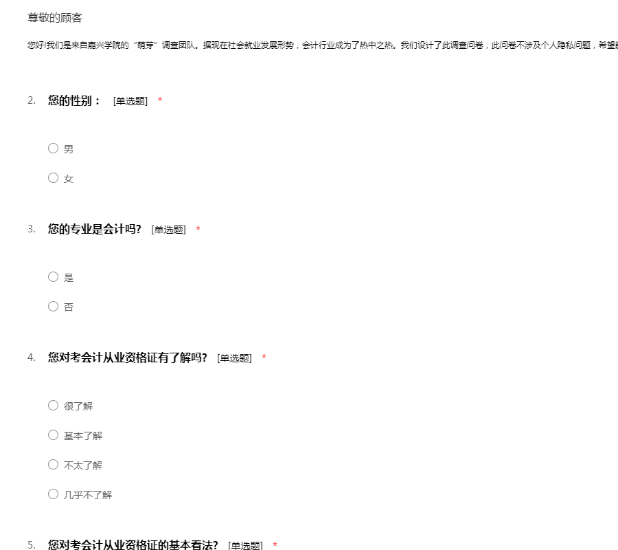 您好!我们是来自嘉兴学院的“萌芽”调查团队。据现在社会就业发展形势,会计行业成为了热中之热。我们设计了此调查问卷,此问卷不涉及个人隐私问题,希望能得到您的支持。谢谢!