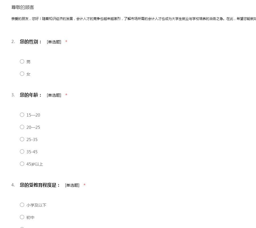 你好,非常感谢你能参与我们的问卷调查,我们正在进行一项关于会计职 业规划的调查问卷,希望你能抽点时间填写我们的问卷。