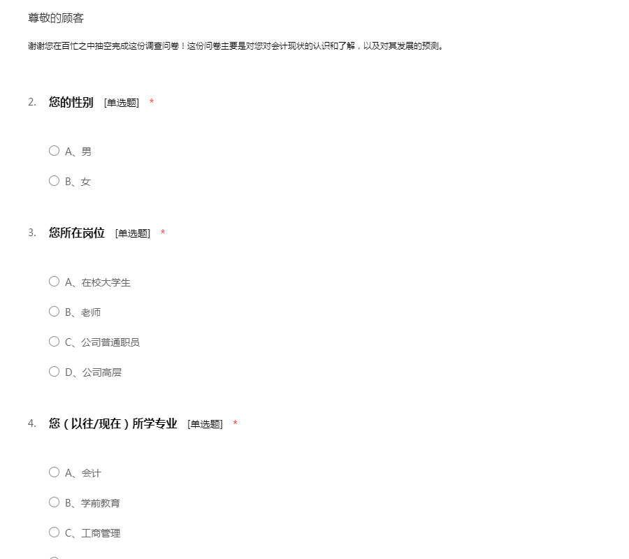 谢谢您在百忙之中抽空完成这份调查问卷!这份问卷主要是对您对会计现状的认识和了解,以及对其发展的预测。