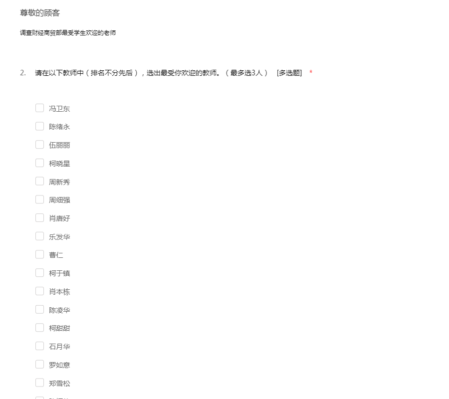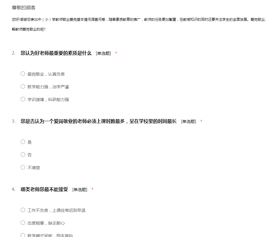 身教言传一向都是为人师表必须谨记的要求。最近,因舍己救学生,而导致自己高位截肢的张丽莉老师,被网友评为最美丽的教师。她高尚的品德广受传诵。为了了解我校教师的师德师风状况,从而更好地开展幼儿教学工作,打造和谐校园,现需要同学们配合填写这份幼儿教师师德问卷调查。