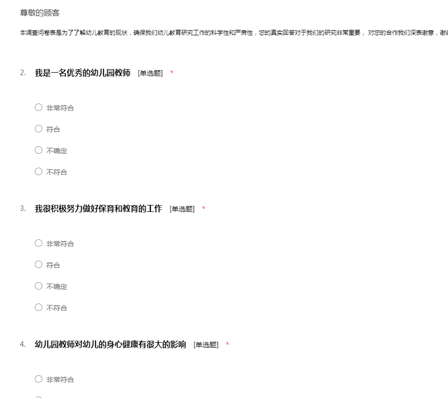 您好!我是51调查网市场调研团队,我们需要做一份关于幼儿教师职业倦怠感问题的问卷调查,旨在测量幼儿教师职业倦怠水平。问卷内容是以不记名形式开展,请放心根据自己的实际情况如实填写。